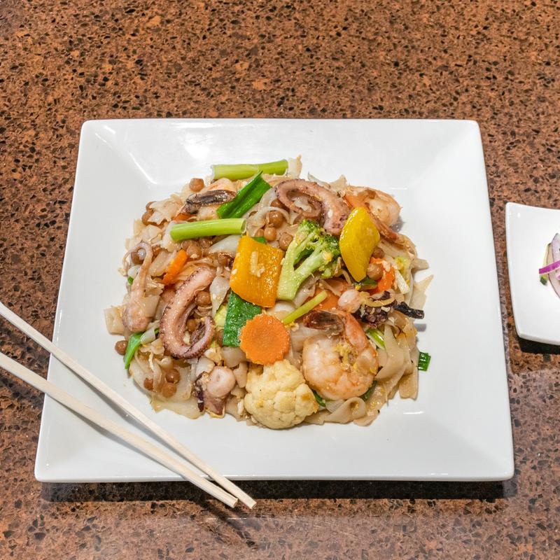 Wide, flat rice noodles fried with squid slices, bean sprouts, prawns, steamed vatana pea, spring onions, pepper and dark soy sauce. It is popular locally where it is found in the southern coastal region of Burma and in Yangon.