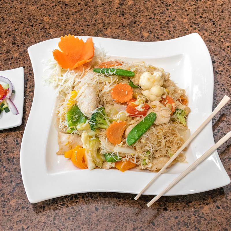 Burmese fried vermicelli noodles made with thin rice noodles and various vegetables with a choice of meat (Chicken, Pork or Seafood).